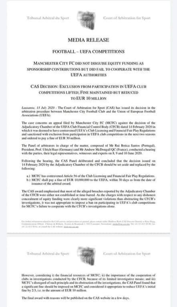 Trước đó, UEFA cáo buộc Man City "vi phạm nghiêm trọng luật công bằng tài chính FFP" và "không cộng tác trong quá trình điều tra". Hình phạt của cơ quan bóng đá đầu não châu Âu dành cho Man City là cấm dự Champions League trong 2 mùa, 30 triệu euro và cấm chuyển nhượng.
